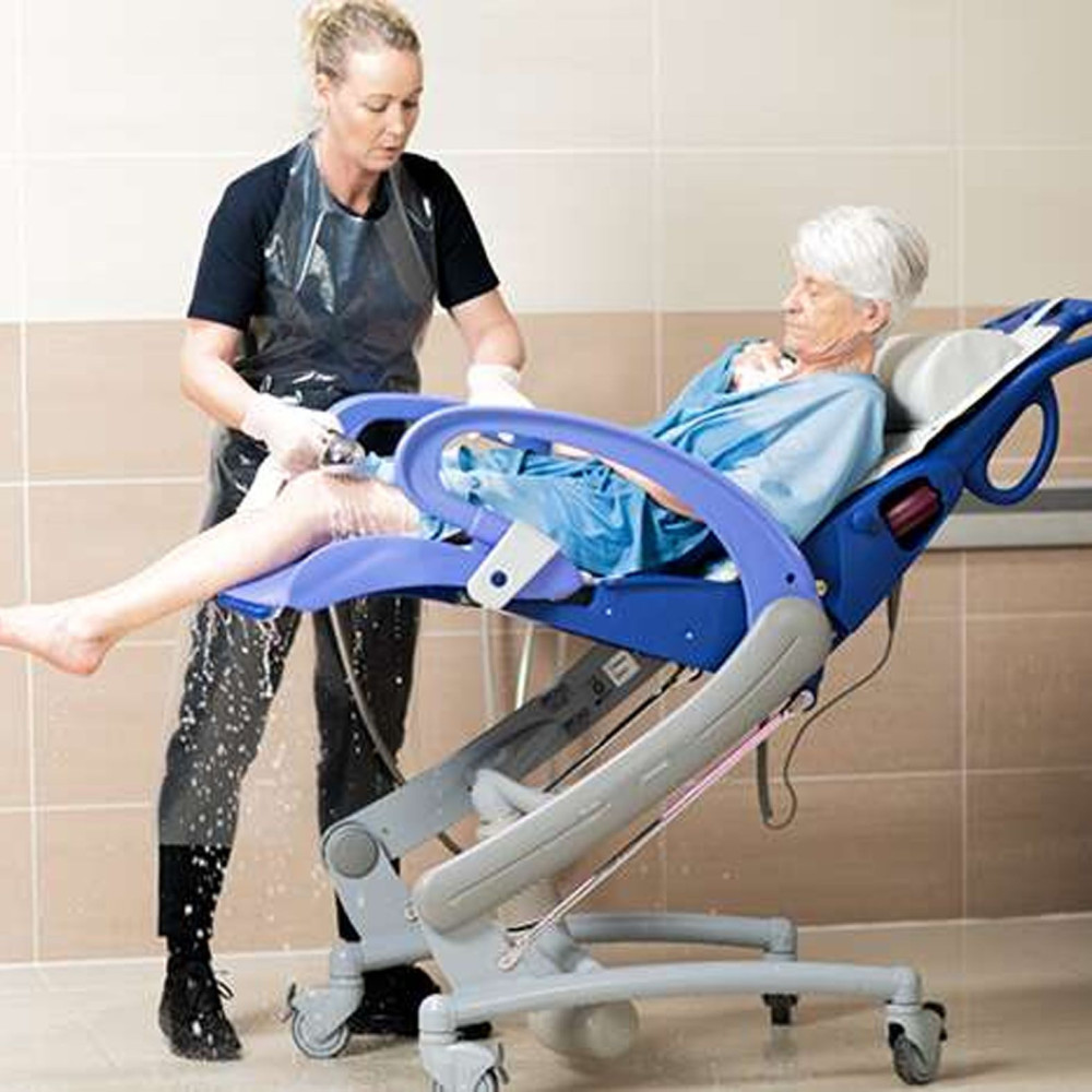 - Az állítható magasságú és dönthető Carendo lehetővé teszi, hogy a gondozó és a lakó elérje kívánt magasságát és pozícióját a higiéniai rutin során.