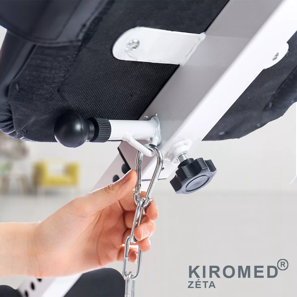 A lánc stabilan biztosítja azt is, hogy nyújtás közben a kívántnál lejjebb ne billenjen, így teljes biztonságérzetet ad a kezelés alatt.